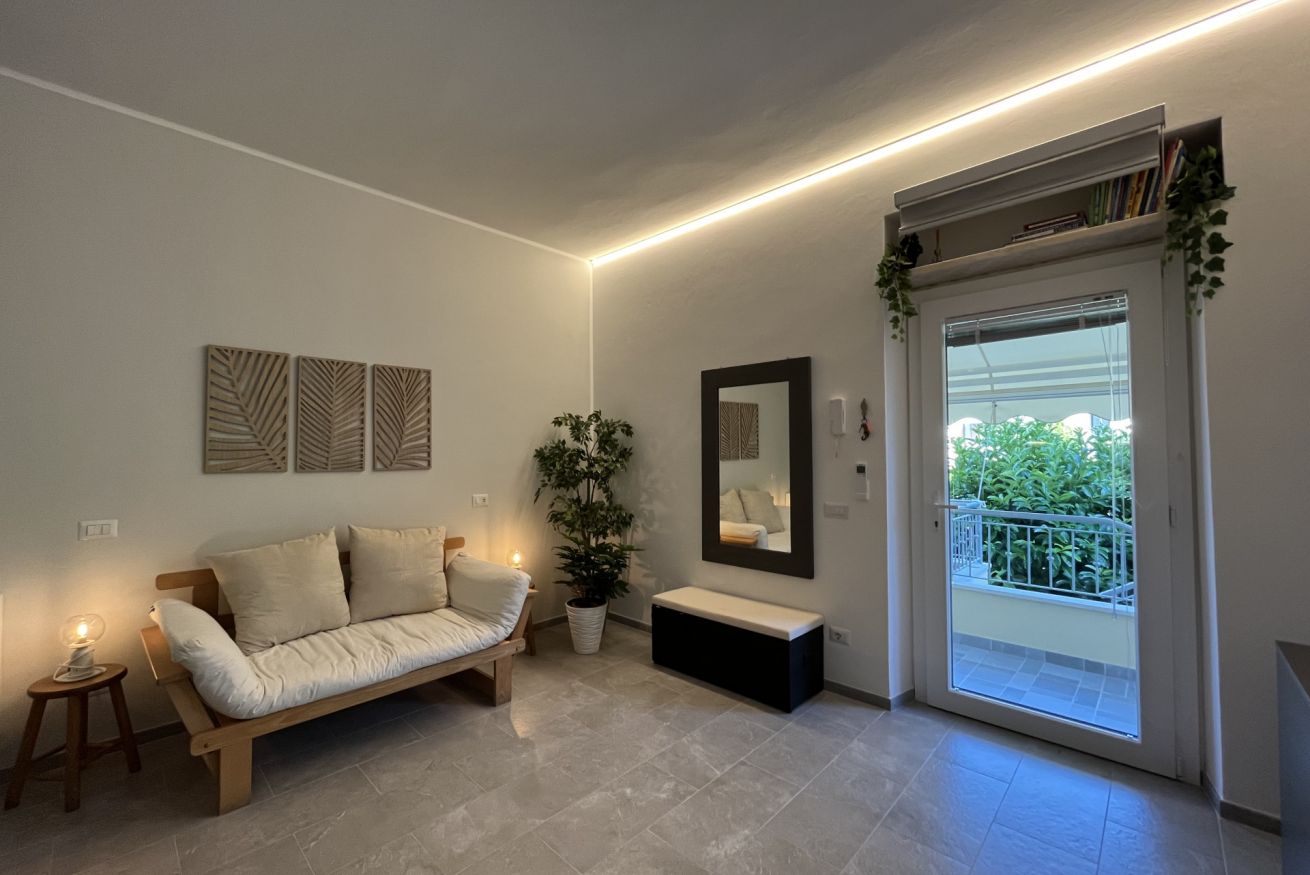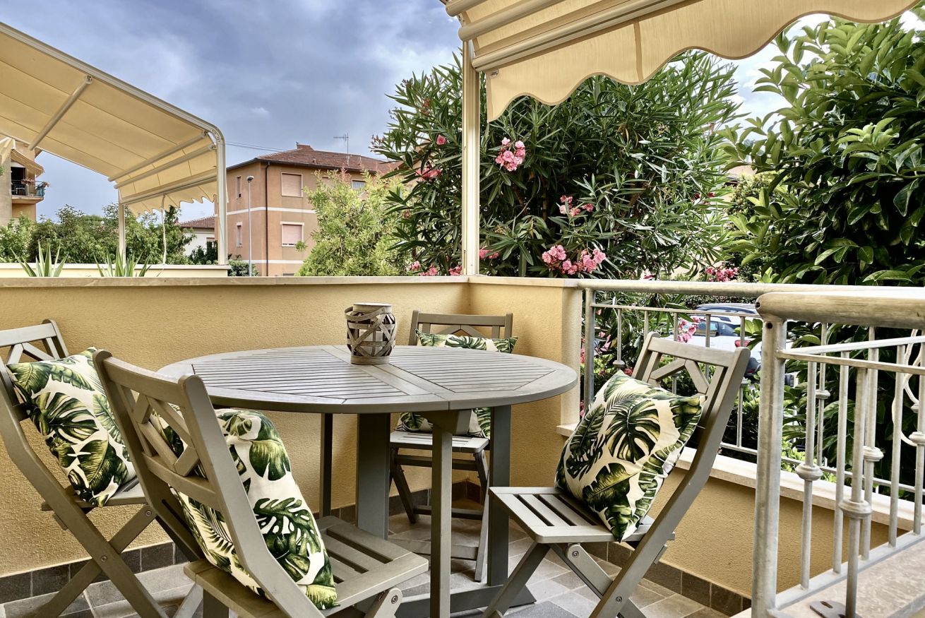 Bilocale completamente ristrutturato al piano terra rialzato di un condominio vicino al mare, con ingresso indipendente dalla terrazza. E' composto da soggiorno con divano letto singolo, angolo cottura con lavatrice, lavastoviglie, piano ad induzione, macchina per caffè a cialde. La terrazza è il punto di forza dell'appartamento: è l'estensione naturale del soggiorno ed attrezzata per mangiare all'aperto immerso nel verde del giardino e schermata dal sole del pomeriggio da una grande tenda da sole. Troverai una camera matrimoniale grande con letto comodo e cuscini in memory foam ed un divano letto singolo per far dormire i tuoi piccoli con te. Il bagno è con doccia e dotato di finestra. Quello che ti sorprenderà di questo appartamento è il fatto che ci troverai tutte le dotazioni di casa tua e potrai finalmente prenotarlo portandoti solo i tuoi vestiti: tutto il resto lo trovi già in casa, dalla batteria di pentole con fondo in acciaio a 3 tipi di macchine per caffè, da un set di coltelli professionali alla biancheria da bagno e da letto. L'appartamento è inoltre dotato di wifi veloce gratuito e aria condizionata. E' l'appartamento perfetto anche per una coppia con bambini piccoli, perché fornito di tutto: lettino con sponde a seggiolone, oltre a tante piccole attenzioni che la proprietaria ha riservato per voi. E anche se hai un amico a quattro zampe con te, troverai già una piccola cuccia e una ciotola dell'acqua. La vicinanza al mare (3 minuti a piedi) e al centro, oltre alla facilità di trovare parcheggio pubblico gratuito nelle vicinanze, ne fa un appartamento estremamente comodo e molto richiesto.