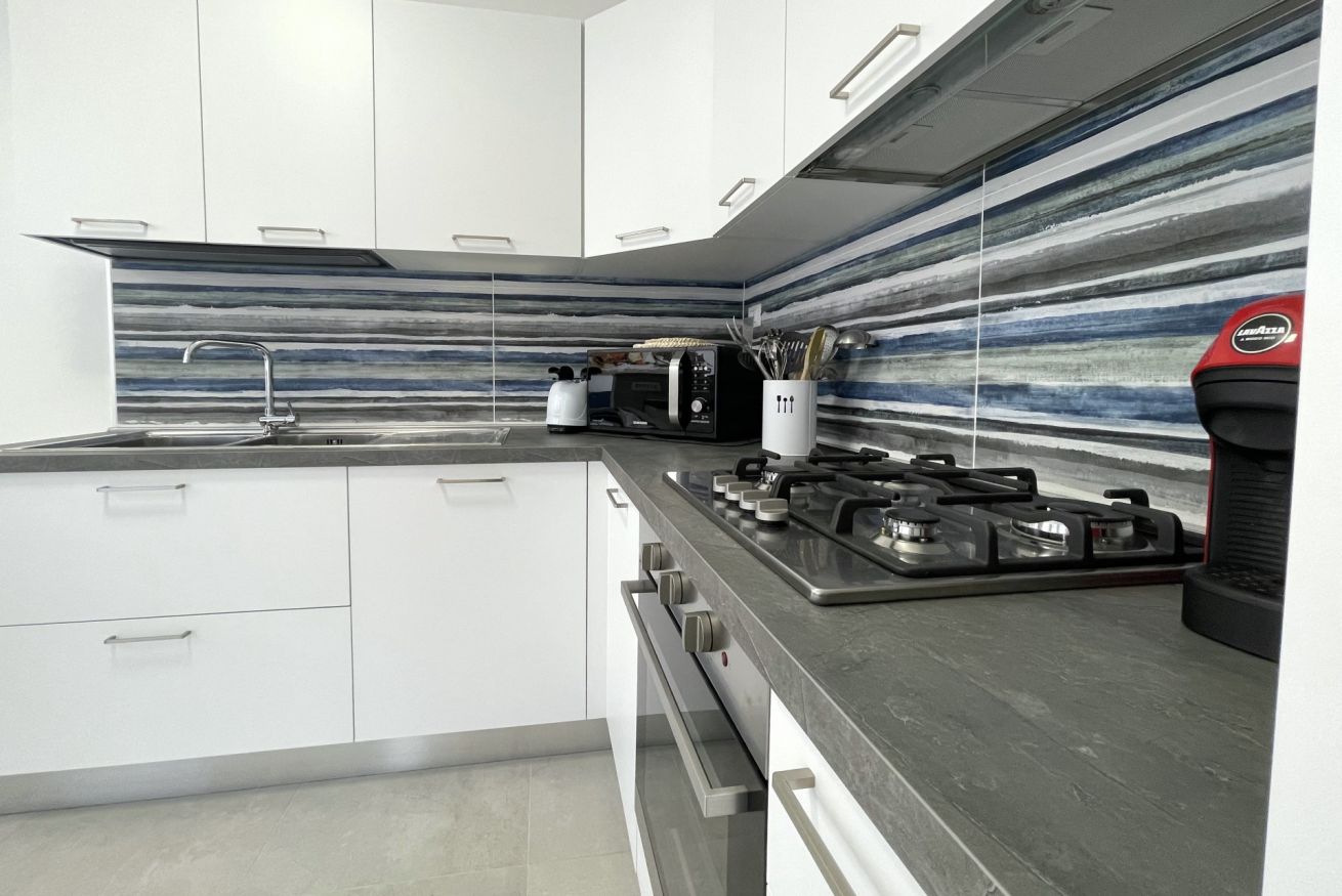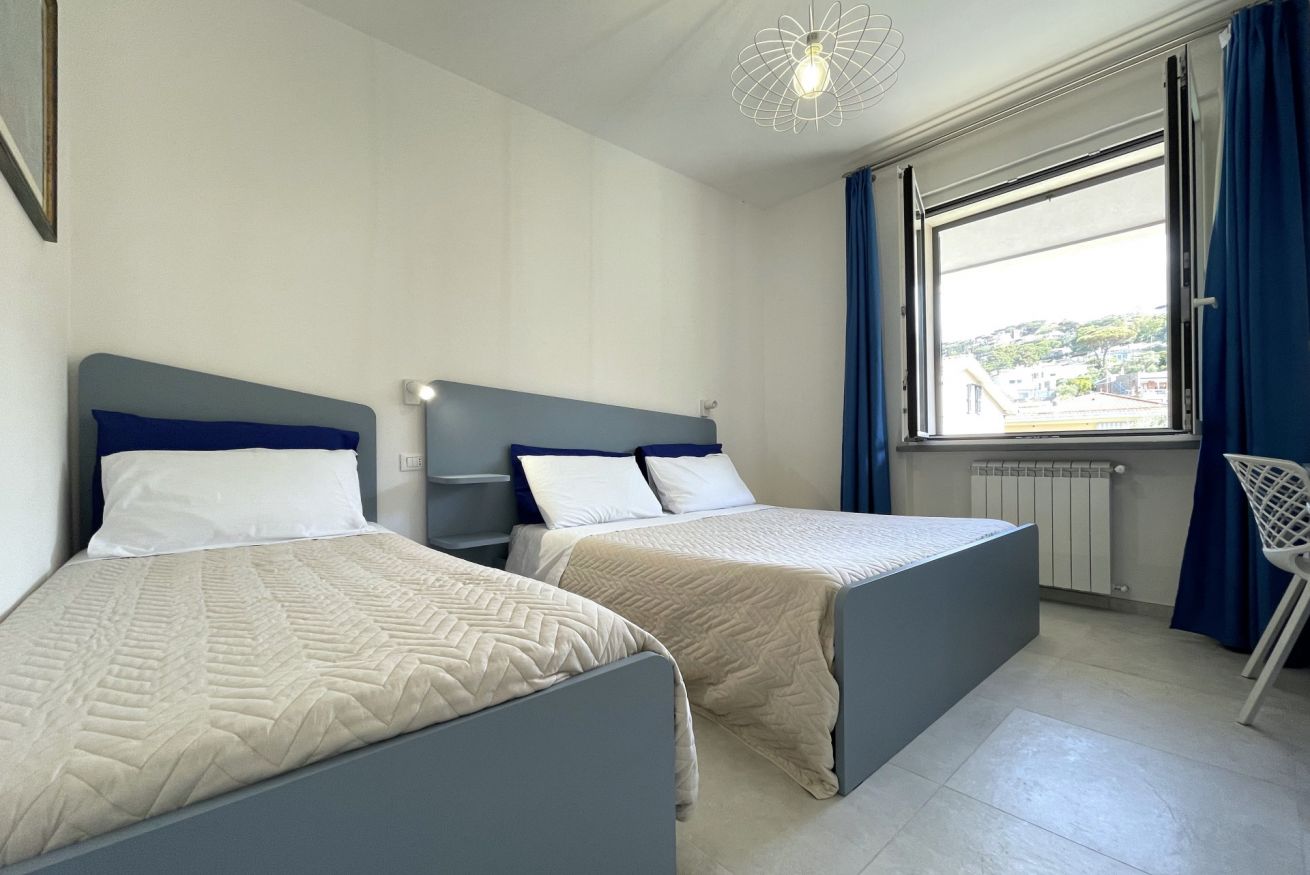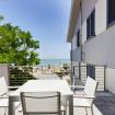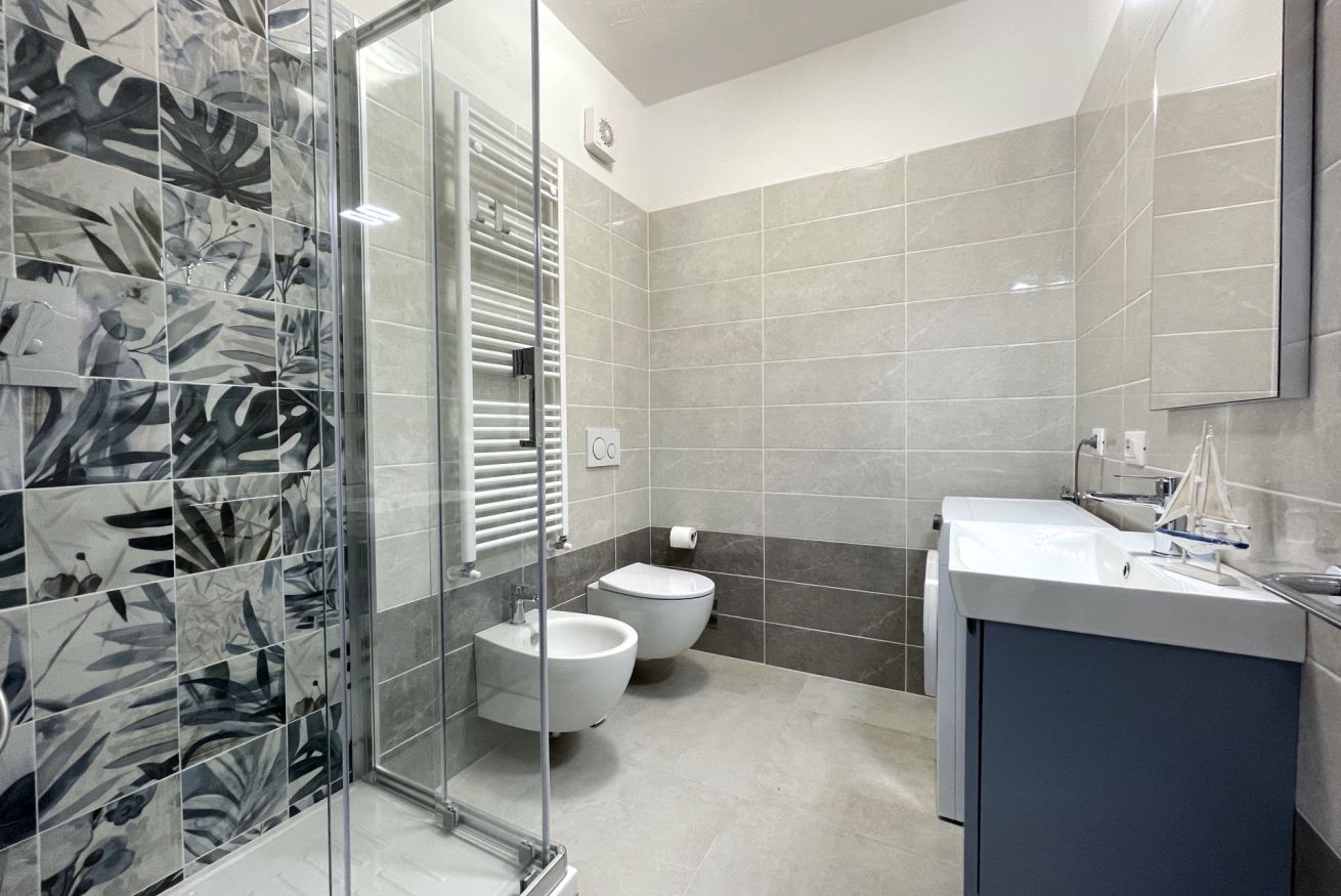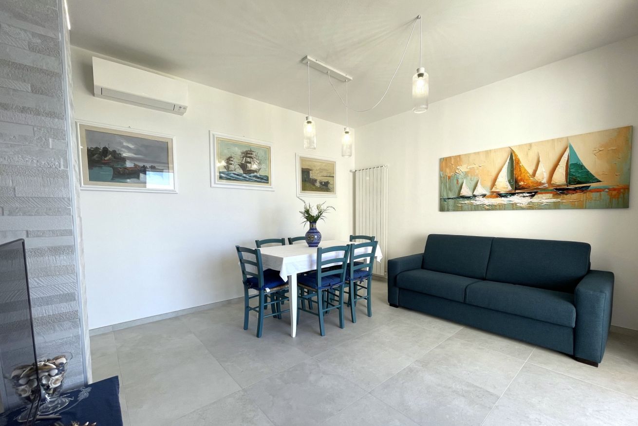 L'appartamento, centralissimo e comodo, presenta un moderno soggiorno openspace con angolo cottura completamente attrezzato. Una grande vetrata vista mare conduce al terrazzo riparato da una comoda tenda da sole, che è l’ideale per pranzi e cene all'aperto. Le due accoglienti camere da letto offrono una sistemazione flessibile: una con letto matrimoniale e l'altra con letto matrimoniale e un letto singolo. I due spaziosi bagni sono entrambi dotati di doccia, uno con finestra per una ventilazione naturale e uno con aspiratore.