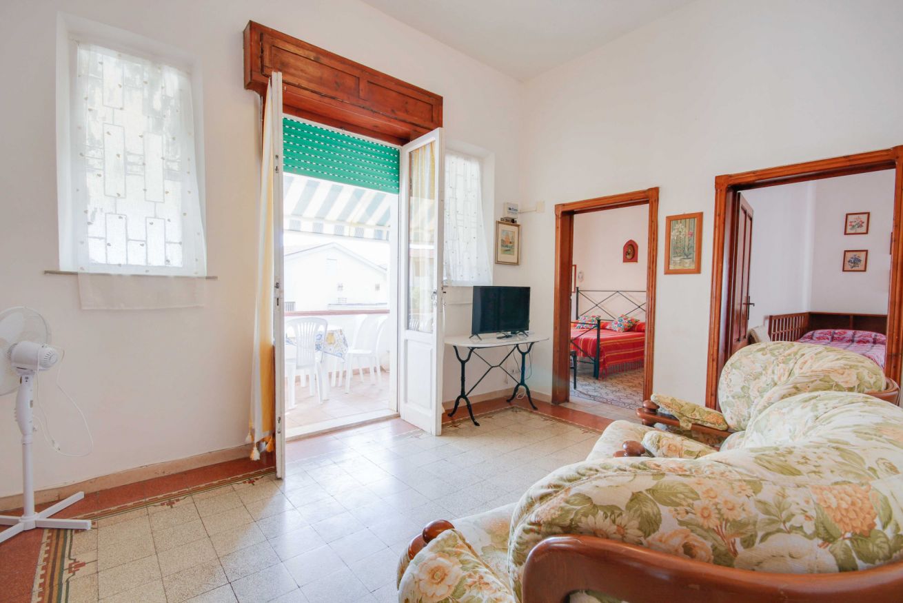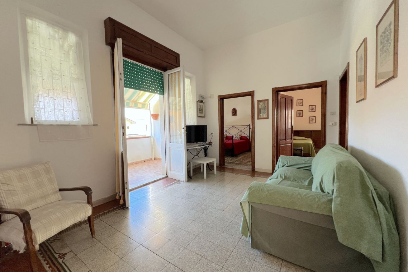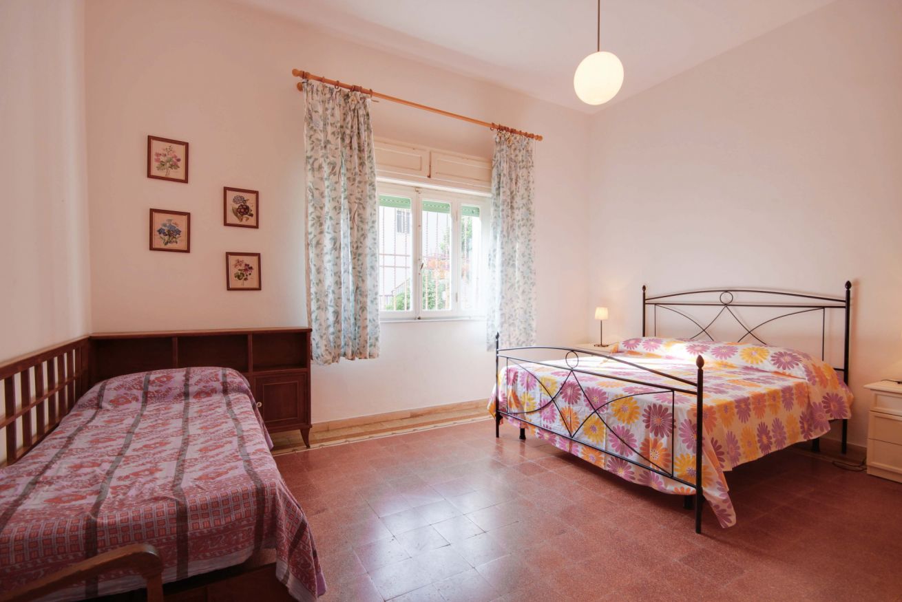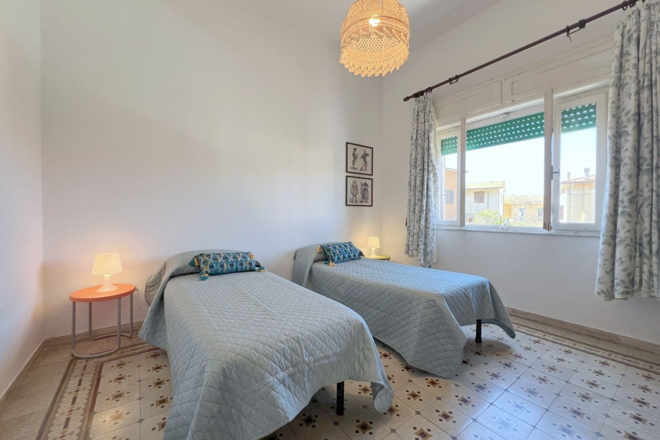 Ampio e accogliente appartamento, situato al primo piano di un piccolo edificio composto da soli tre appartamenti, vicinissimo al centro e a soli 150 metri dal mare. L'appartamento è composto da soggiorno luminoso che apre sulla terrazza allestita per mangiare all'aperto e coperta da tenda, cucina con tavolo e sedie, frigo/freezer, forno/fornelli a gas bombola e accesso a spazio esterno sul retro con lavatrice e stenditoio, due camere matrimoniali di cui una con letto singolo, una camera con due letti singoli, un bagno con doccia, e un piccolo spazio esterno al piano terra.