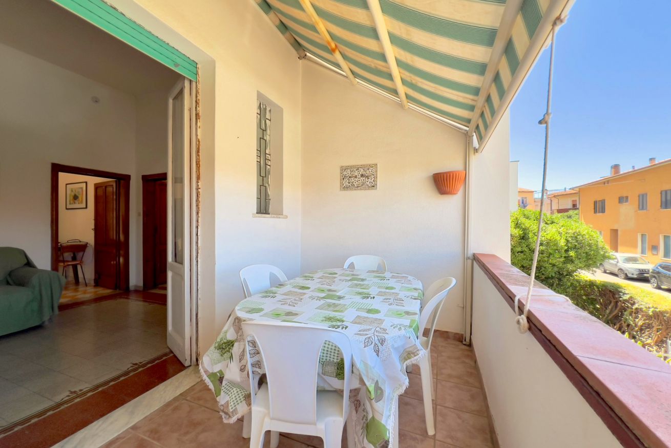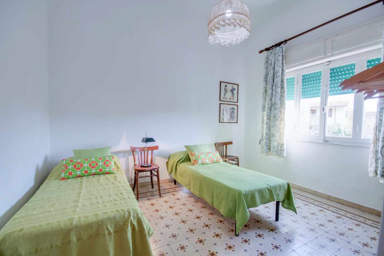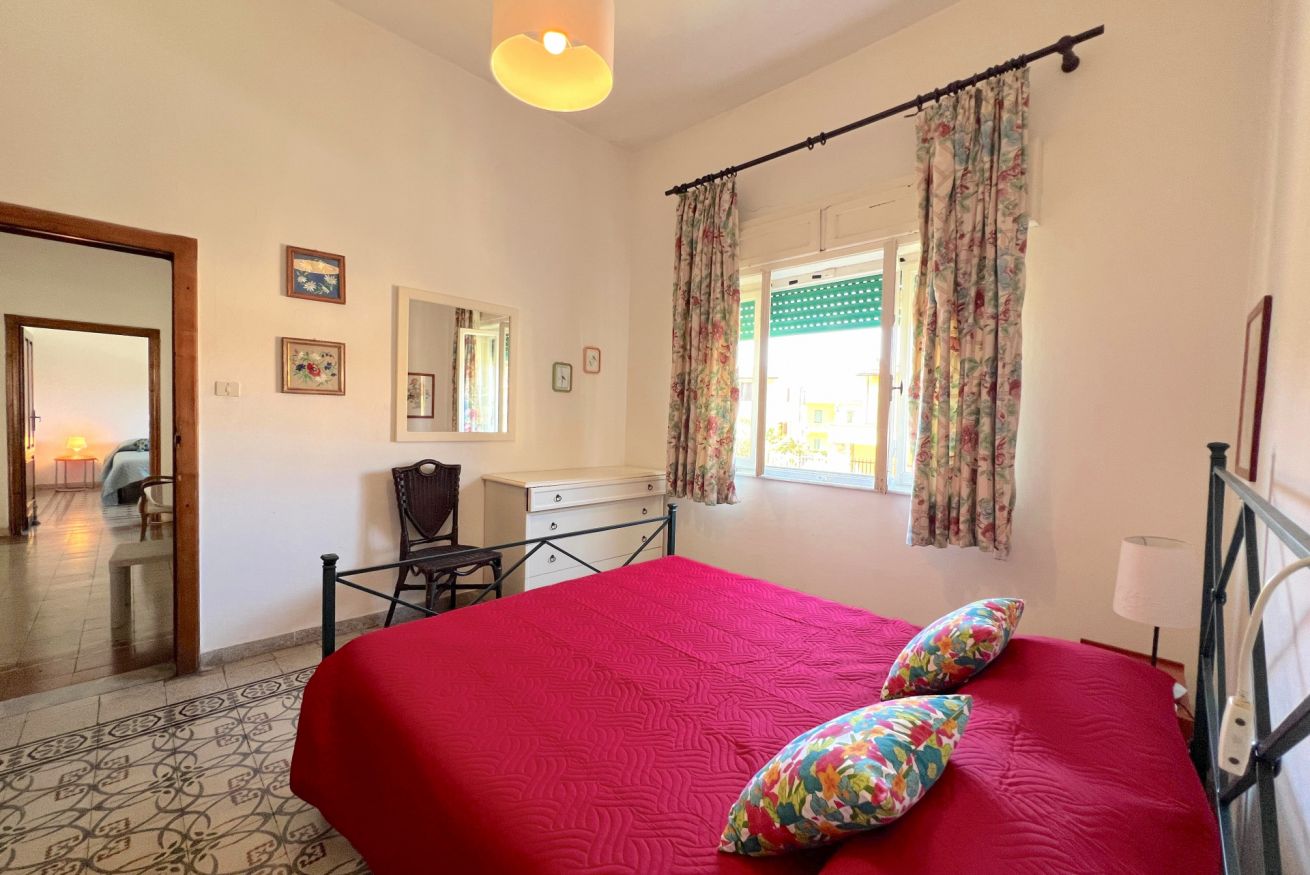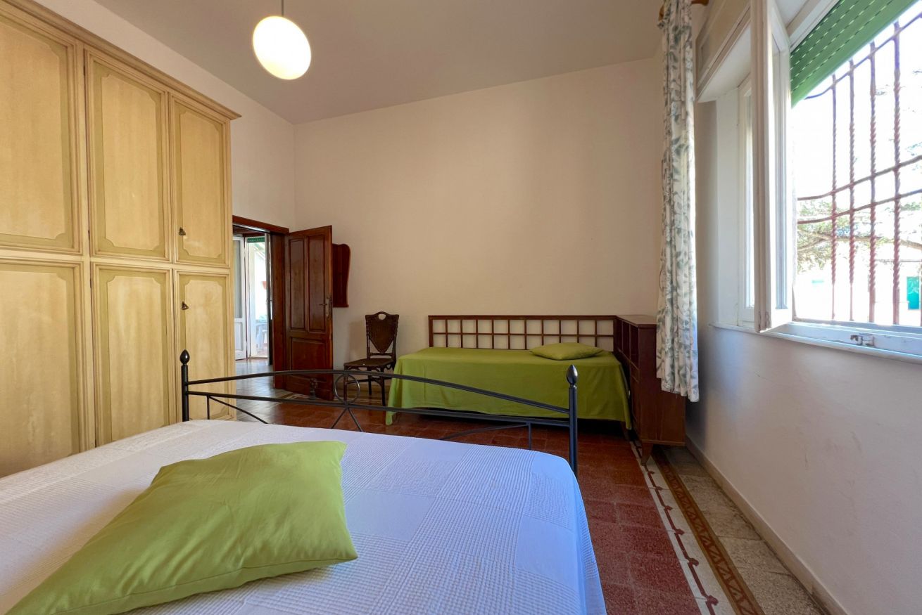 Ampio e accogliente appartamento, situato al primo piano di un piccolo edificio composto da soli tre appartamenti, vicinissimo al centro e a soli 150 metri dal mare. L'appartamento è composto da soggiorno luminoso che apre sulla terrazza allestita per mangiare all'aperto e coperta da tenda, cucina con tavolo e sedie, frigo/freezer, forno/fornelli a gas bombola e accesso a spazio esterno sul retro con lavatrice e stenditoio, due camere matrimoniali di cui una con letto singolo, una camera con due letti singoli, un bagno con doccia, e un piccolo spazio esterno al piano terra.