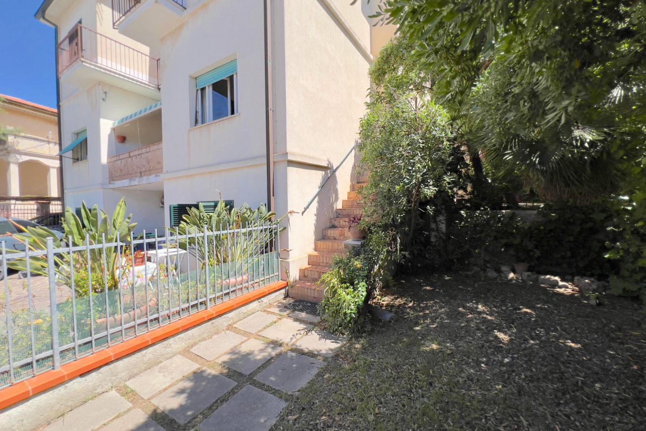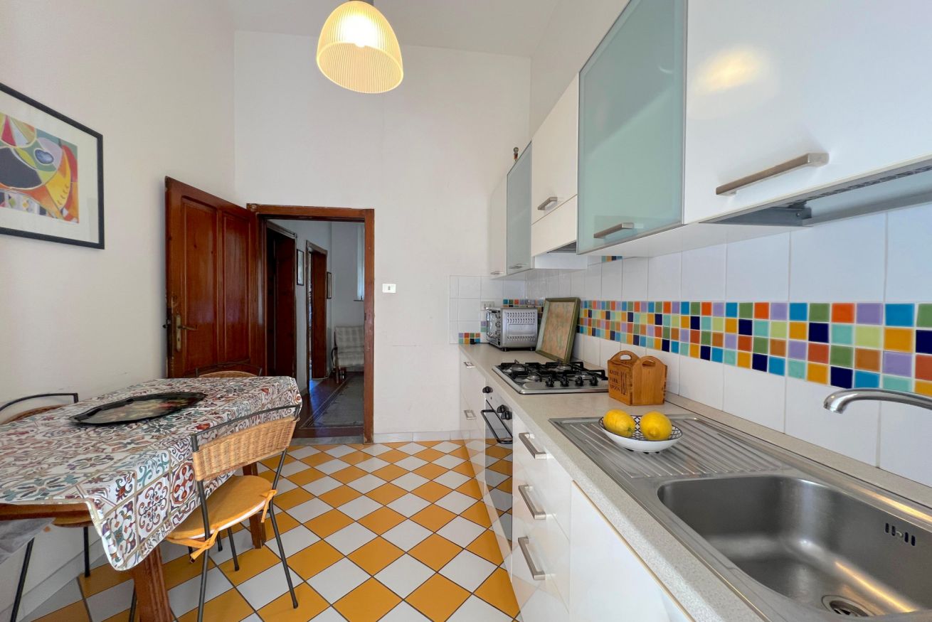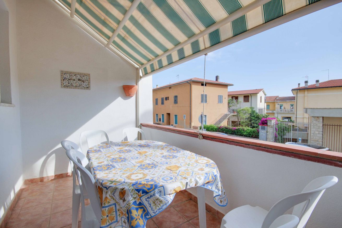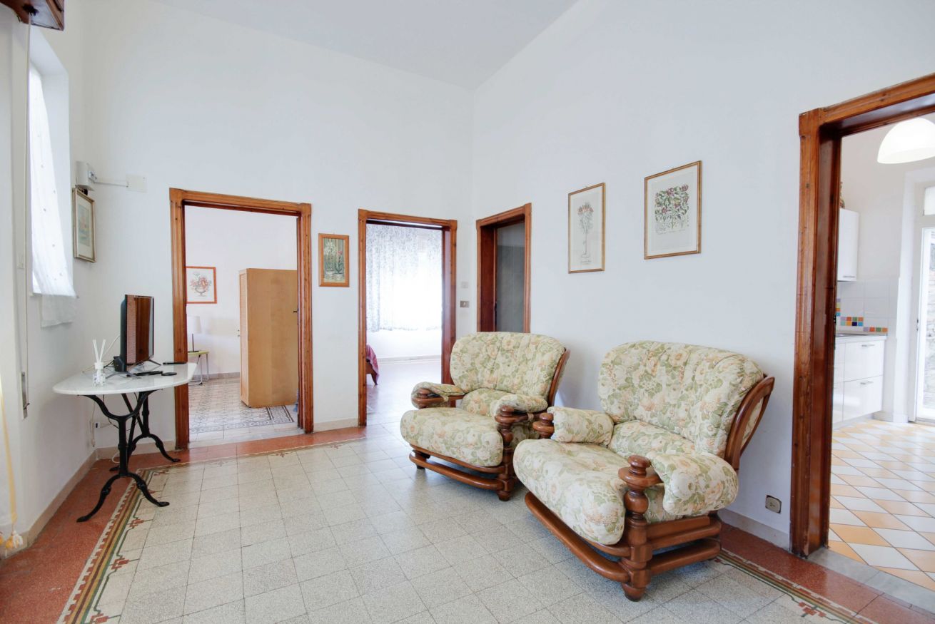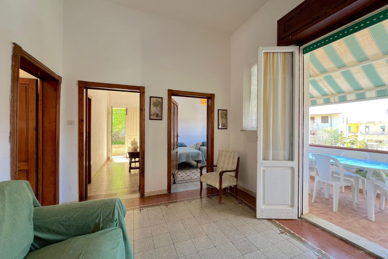 Ampio e accogliente appartamento, situato al primo piano di un piccolo edificio composto da soli tre appartamenti, vicinissimo al centro e a soli 150 metri dal mare. L'appartamento è composto da soggiorno luminoso che apre sulla terrazza allestita per mangiare all'aperto e coperta da tenda, cucina con tavolo e sedie, frigo/freezer, forno/fornelli a gas bombola e accesso a spazio esterno sul retro con lavatrice e stenditoio, due camere matrimoniali di cui una con letto singolo, una camera con due letti singoli, un bagno con doccia, e un piccolo spazio esterno al piano terra.
