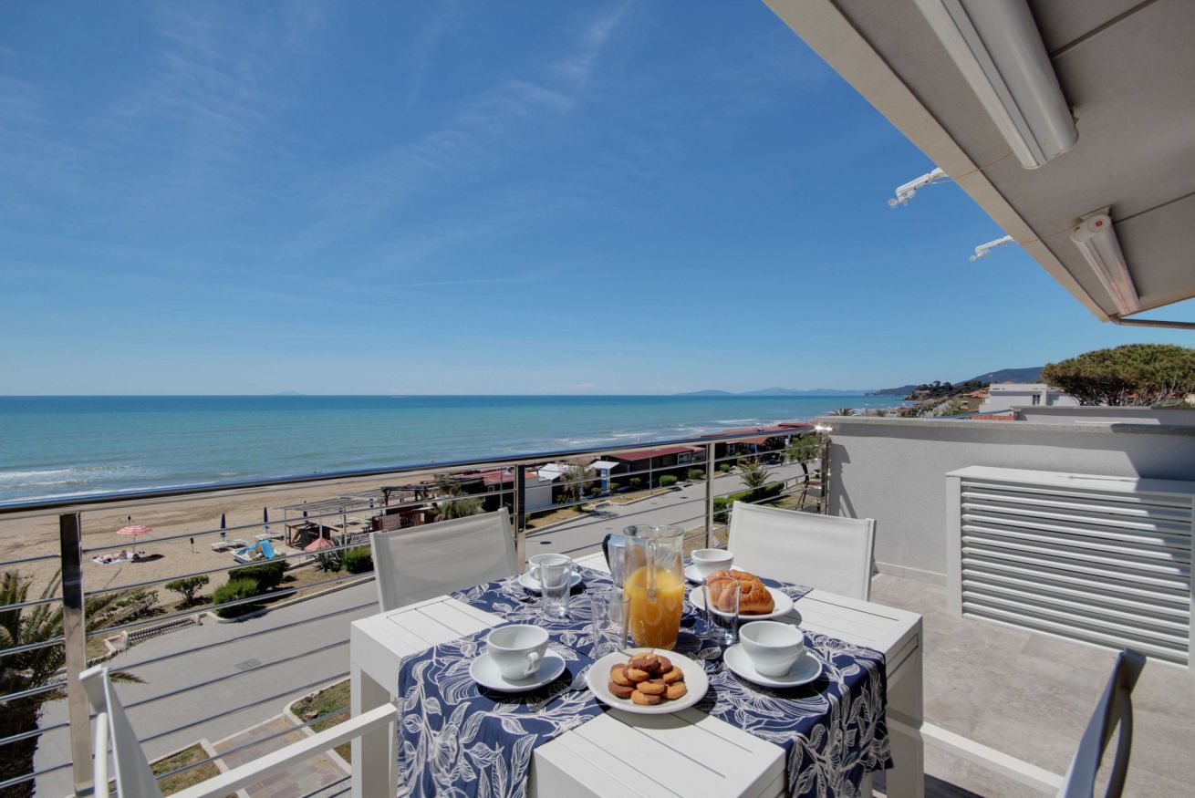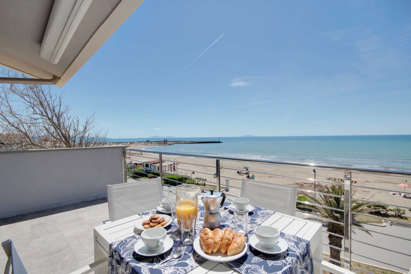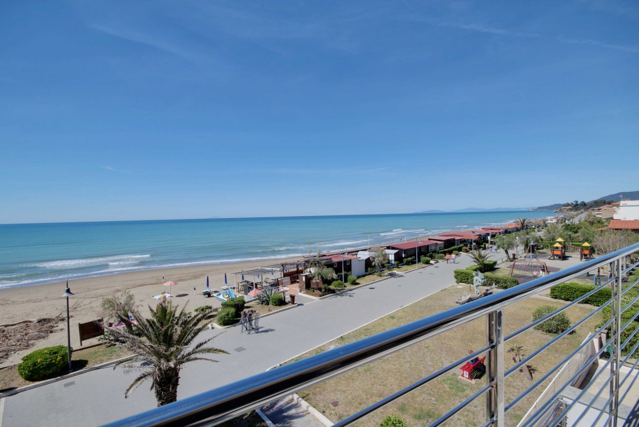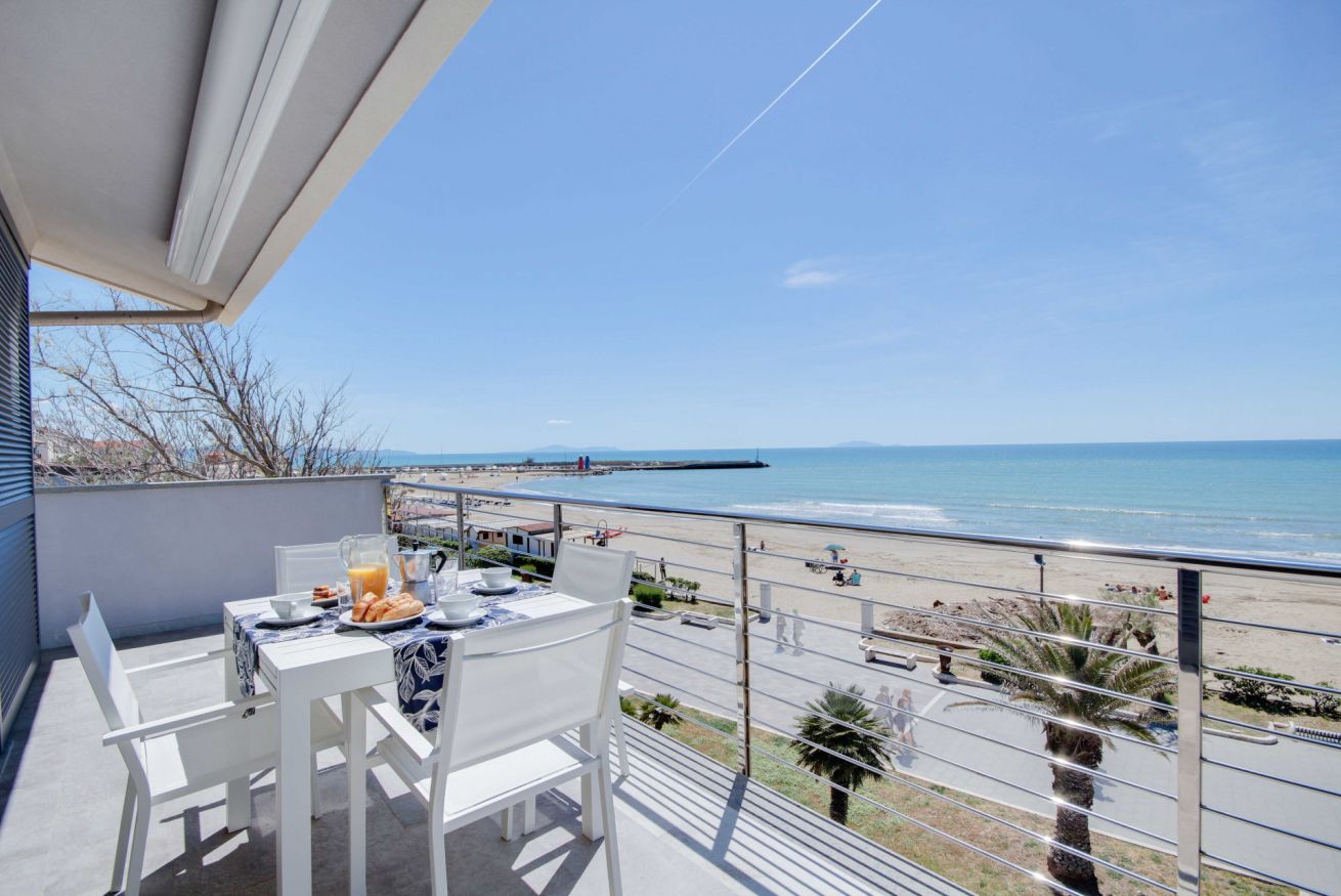 Appartamento con vista mozzafiato, direttamente sulla passeggiata del lungomare di Via Roma, a soli 20 metri dalla spiaggia con posto auto e climatizzatore. Si trova al terzo ed ultimo piano (senza ascensore), ma con una delle viste panoramiche migliori di tutto il litorale, con una vista meravigliosa dall'Argentario all'isola d'Elba. L'appartamento di 70 mq. circa è composto da ingresso con comodo armadio, soggiorno con terrazza allestita per mangiare all'aperto e con tenda da sole elettrica che si riavvolge automaticamente quando il vento è troppo forte (divano letto singolo in soggiorno), cucinotto, camera matrimoniale, camera con tre letti singoli, bagno con doccia (senza finestra ma con aspiratore), ed un posto auto in corte condominiale. Dalla casa si accede direttamente al lungomare tramite cancello pedonale, senza dover attraversare strade trafficate o fare il giro dell'isolato: potrai portare i tuoi bimbi al mare in assoluta sicurezza. L'appartamento dispone di wifi e climatizzatore centralizzato (la temperatura viene regolata da un termostato che assicura la stessa temperatura in ogni stanza).