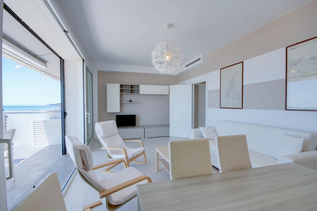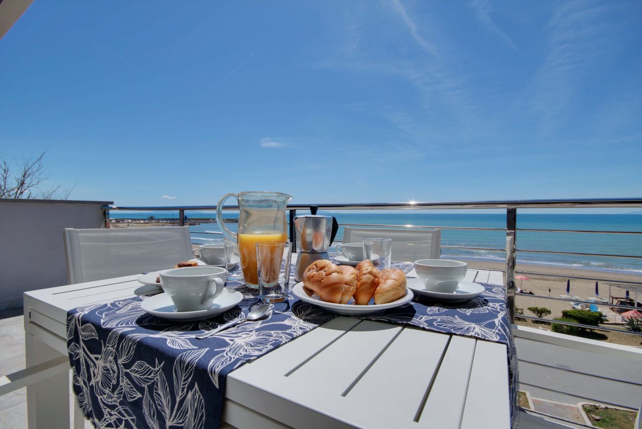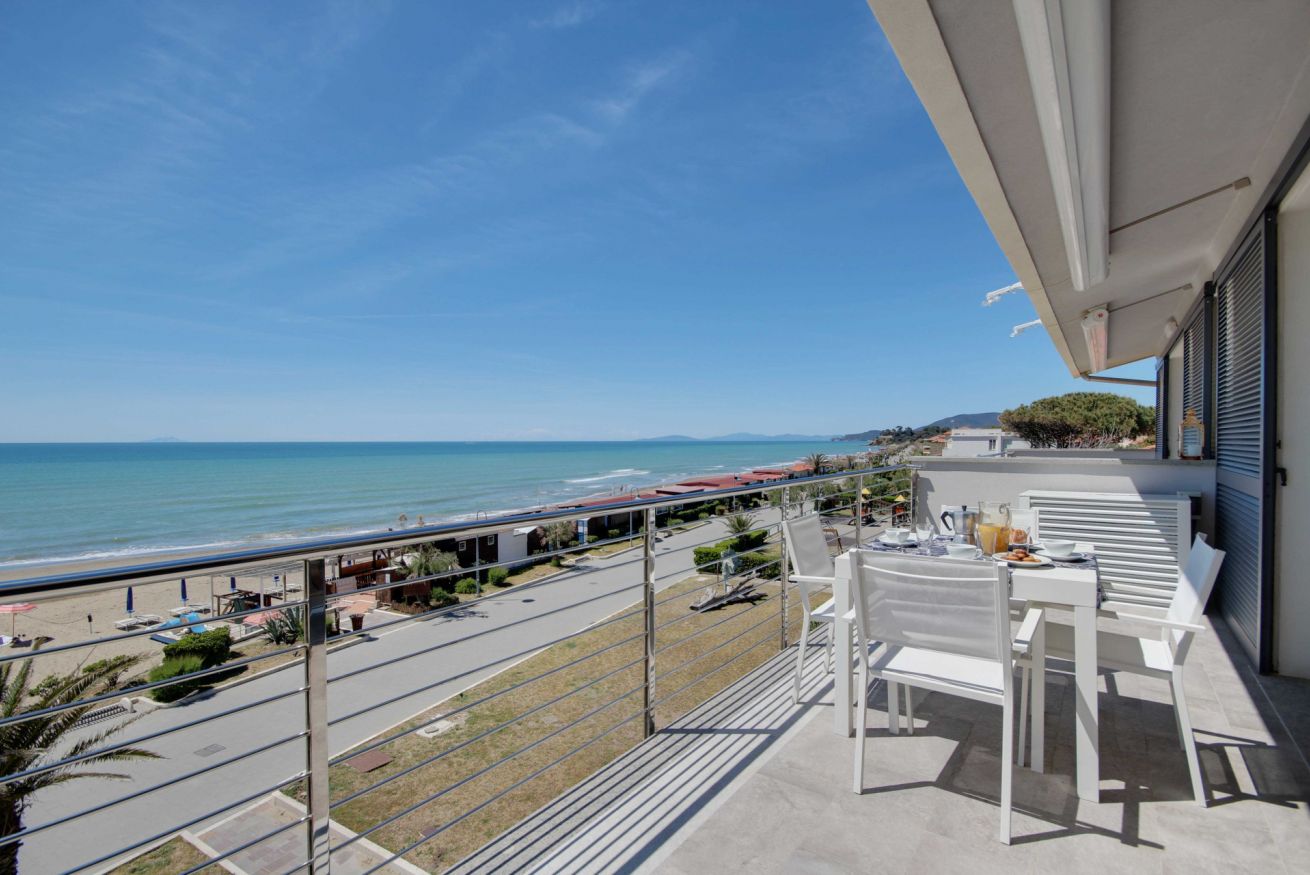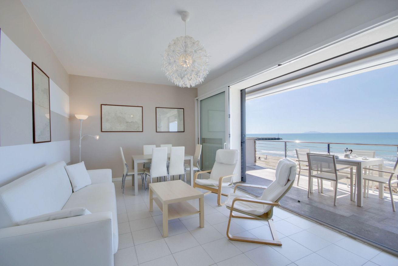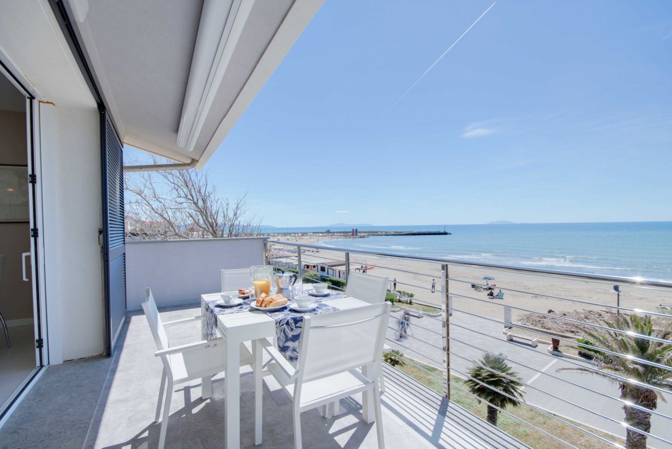 Appartamento con vista mozzafiato, direttamente sulla passeggiata del lungomare di Via Roma, a soli 20 metri dalla spiaggia con posto auto e climatizzatore. Si trova al terzo ed ultimo piano (senza ascensore), ma con una delle viste panoramiche migliori di tutto il litorale, con una vista meravigliosa dall'Argentario all'isola d'Elba. L'appartamento di 70 mq. circa è composto da ingresso con comodo armadio, soggiorno con terrazza allestita per mangiare all'aperto e con tenda da sole elettrica che si riavvolge automaticamente quando il vento è troppo forte (divano letto singolo in soggiorno), cucinotto, camera matrimoniale, camera con tre letti singoli, bagno con doccia (senza finestra ma con aspiratore), ed un posto auto in corte condominiale. Dalla casa si accede direttamente al lungomare tramite cancello pedonale, senza dover attraversare strade trafficate o fare il giro dell'isolato: potrai portare i tuoi bimbi al mare in assoluta sicurezza. L'appartamento dispone di wifi e climatizzatore centralizzato (la temperatura viene regolata da un termostato che assicura la stessa temperatura in ogni stanza).
