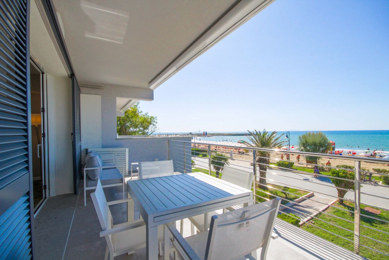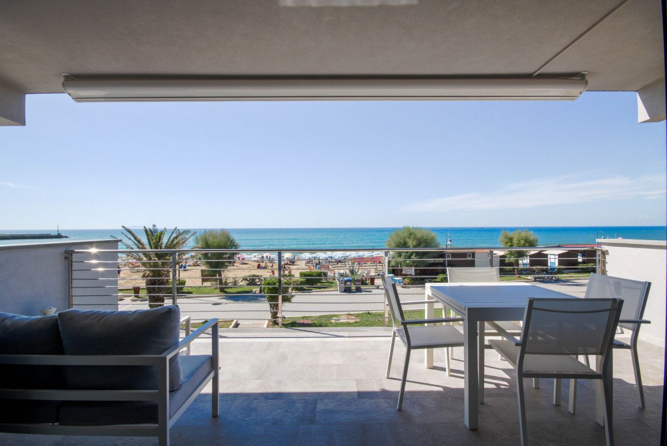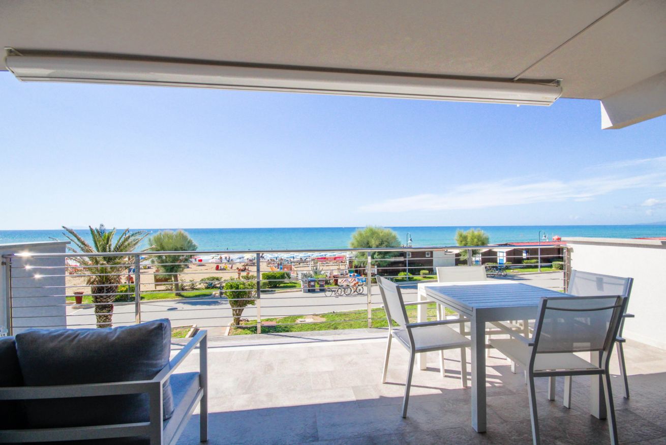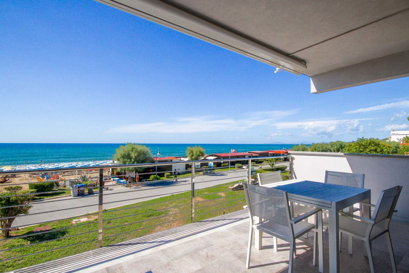 Appartamento con due grande terrazze affacciate sul lungo mare di Via Roma, a soli 20 metri dal mare, e con una vista panoramica sulla costa dell'arcipelago toscano. E' composto da grande soggiorno dotato di divano e zona pranzo, con accesso alla terrazza panoramica fronte mare attrezzata per mangiare all'esterno e coperta da tenda. La cucina nuova è separata dal soggiorno e fornita di lavastoviglie. Ci sono 3 camere: una matrimoniale con accesso alla terrazza fronte mare, una camera con due letti singoli, e una camera con letto singolo e letto estraibile ed accesso al terrazzo condiviso con la camera matrimoniale. Ci sono due bagni entrambi con doccia, uno più grande con finestra e l'altro senza finestra ma con aspiratore. Inoltre, a disposizione degli ospiti c'è un posto auto in garage. Dalla casa si accede direttamente al lungomare tramite cancello pedonale, senza dover attraversare strade trafficate o fare il giro dell'isolato: potrai portare i tuoi bimbi al mare in assoluta sicurezza. L'appartamento dispone di wifi e climatizzatore centralizzato (la temperatura viene regolata da un termostato che assicura la stessa temperatura in ogni stanza).