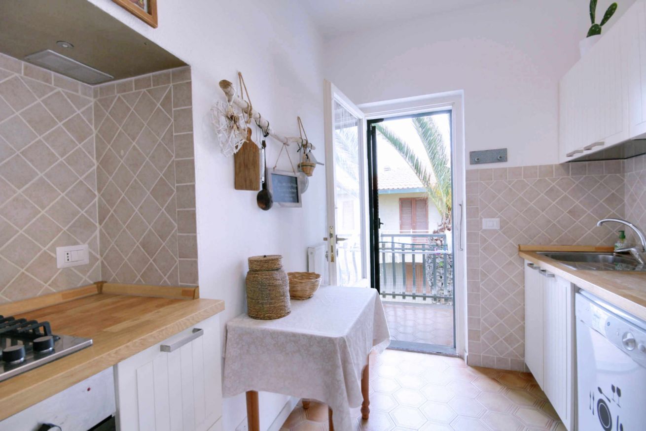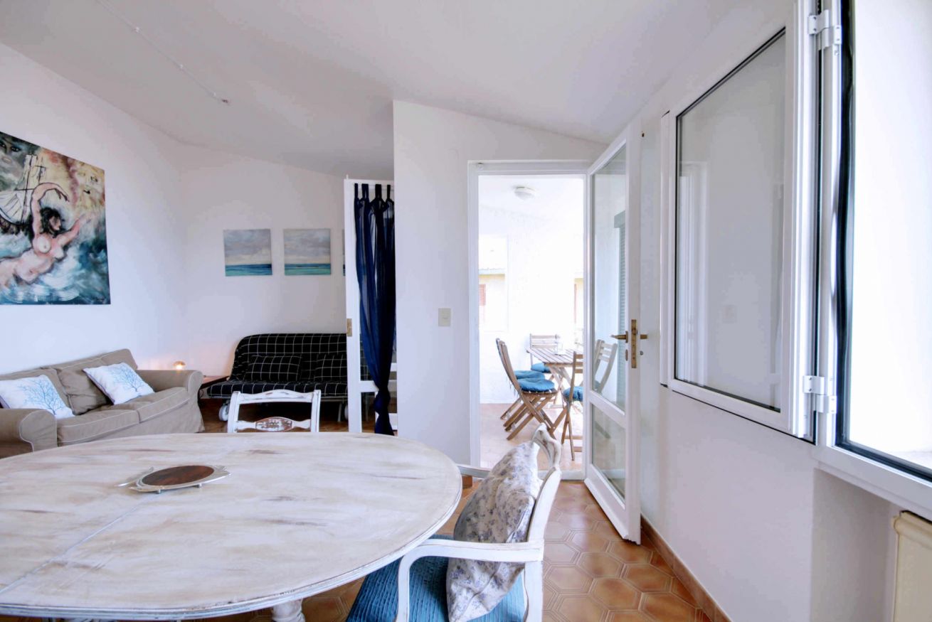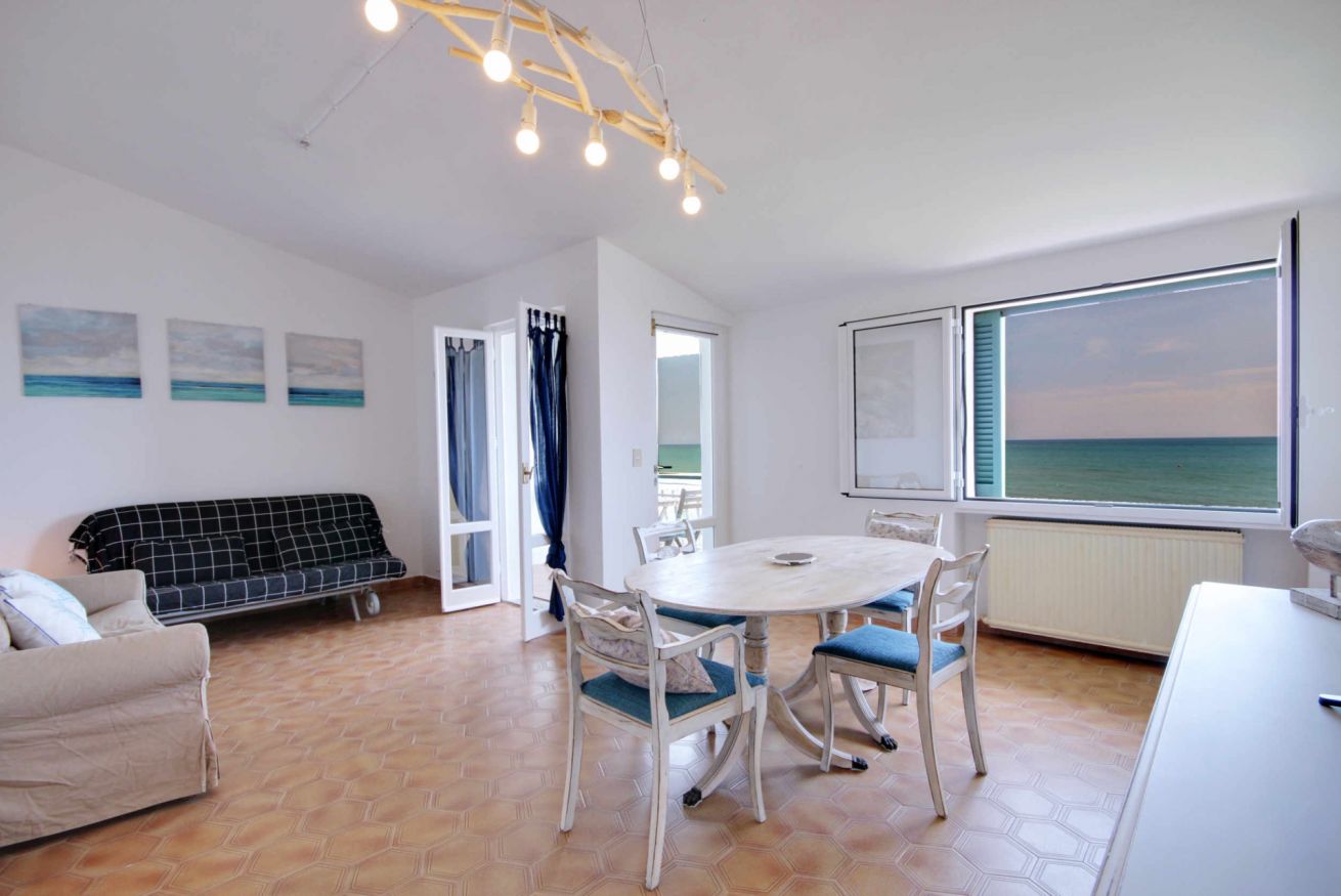L'appartamento in affitto è situato al primo e ultimo piano di una villetta fronte mare, con accesso tramite scala interna condivisa. Il soggiorno è luminoso e arredato con gusto, dotato di tavolo, sedie, divano letto matrimoniale e TV, con ampia finestra vista mare e accesso ad un balcone attrezzato con tavolo e sedie. La cucina separata è ristrutturata e completa di lavastoviglie, forno, frigo/freezer, microonde e macchina da caffè a capsule, inoltre dalla cucina si accede ad un balcone di servizio con lavatrice. Le due camere da letto sul retro affacciano su una corte privata e sono dotate di ampie finestre che rendono molto luminose le stanze. Il bagno ha un pratico box doccia. L'appartamento include un posto auto scoperto nella corte privata e offre connessione wifi veloce e illimitata. La posizione è tranquilla, con accesso diretto al mare attraverso un vialetto privato. Ideale per chi cerca una residenza confortevole in un suggestivo contesto marino.